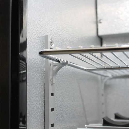 - Shelves: 3 x flat chromed adjustable shelves in one zone, slide out saddle shelving in other