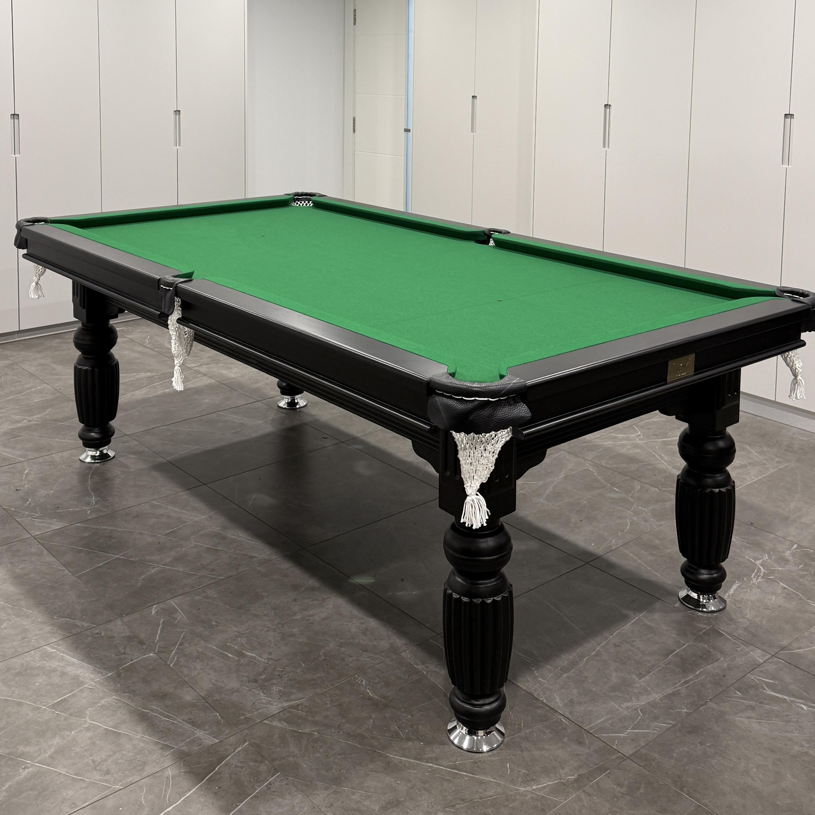 Upgrade your game room with a solid oak slate pool table, designed for durability, precision, and superior gameplay. Built to last, it features a solid oak timber frame, precisely honed 3-piece slate (20mm thick) for a flawless surface, and sturdy, adjustable legs for perfect stability. Enjoy a premium playing experience with double-sided, thick GSM wool felt, hand-stitched black leather pocket shields, and classic white knitted drop-net pockets for a smooth ball landing. Whether for casual games or competitive play, this pool table is a timeless centrepiece. Includes free accessories.